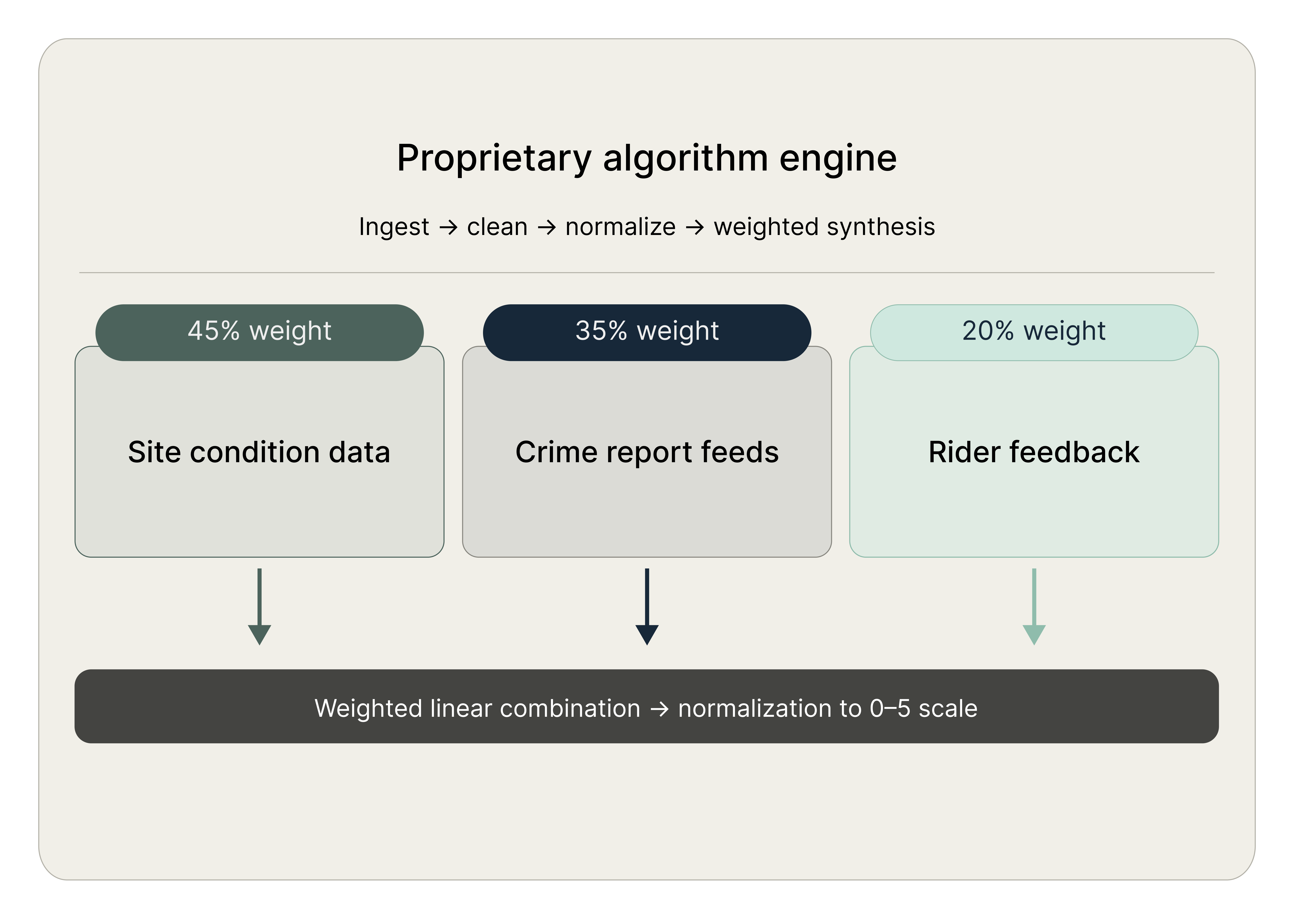 The BPI is a weighted scoring model designed to quantify the security of urban bike parking. By synthesizing physical audits with historical and real-time data, the index provides a standardized metric for safety transparency.